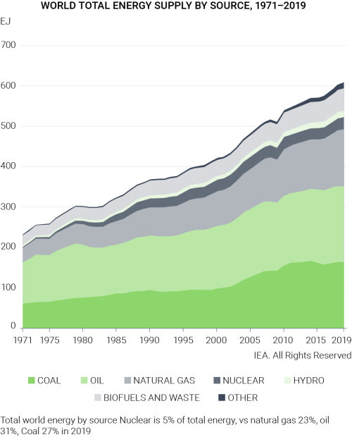Nuclear energy is the world’s second most important low-carbon source of electricity. In 2020, 440 nuclear power reactors in 32 countries produced 10% of the world’s electricity representing 5% of the world’s energy. These amounts will not grow significantly enough to replace oil or coal.