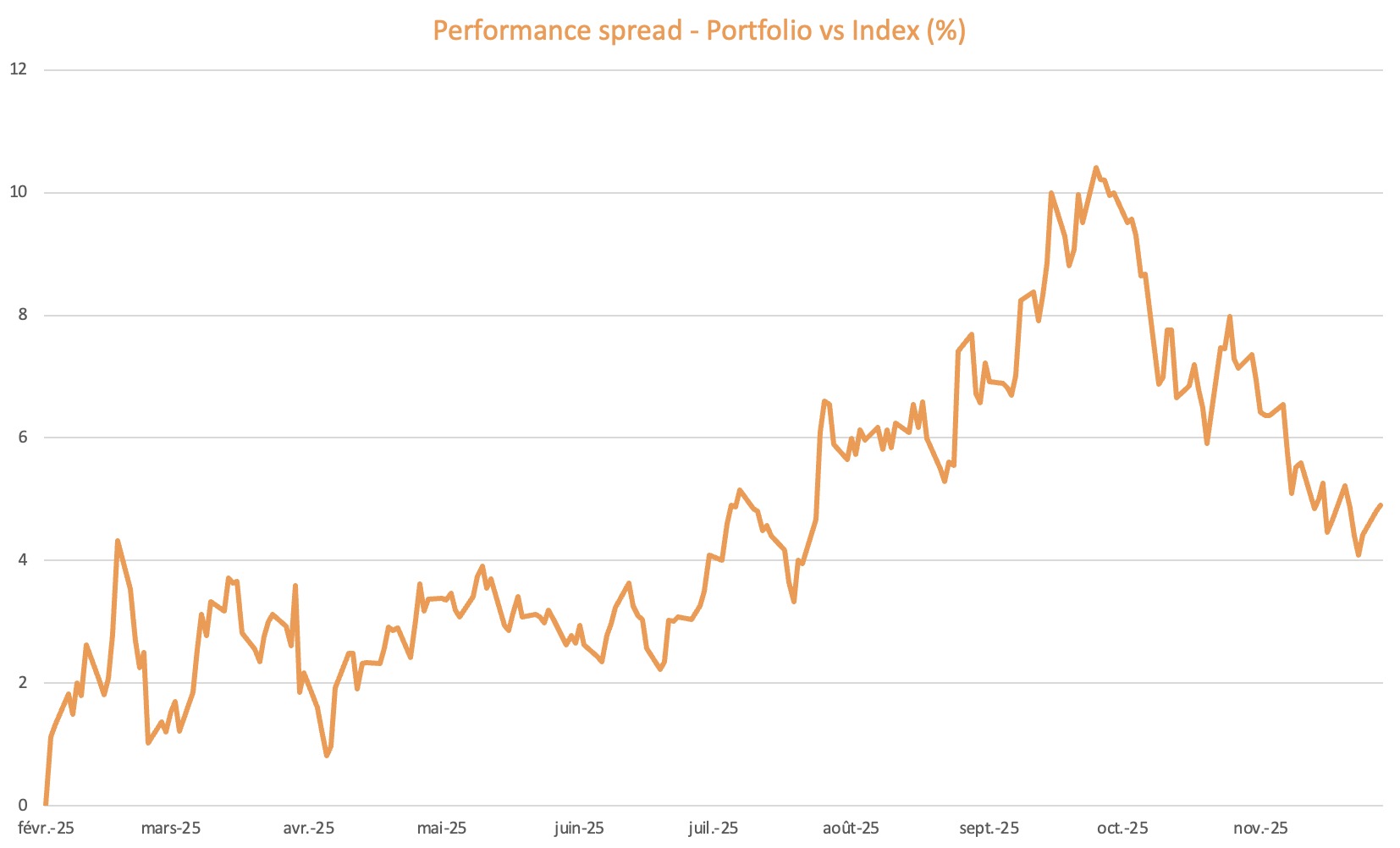 As of early December 2025, our strategy has returned +42% since inception on February 4, 2025. It is outperforming both the underlying index (+37%) and the peers' average (+25%).