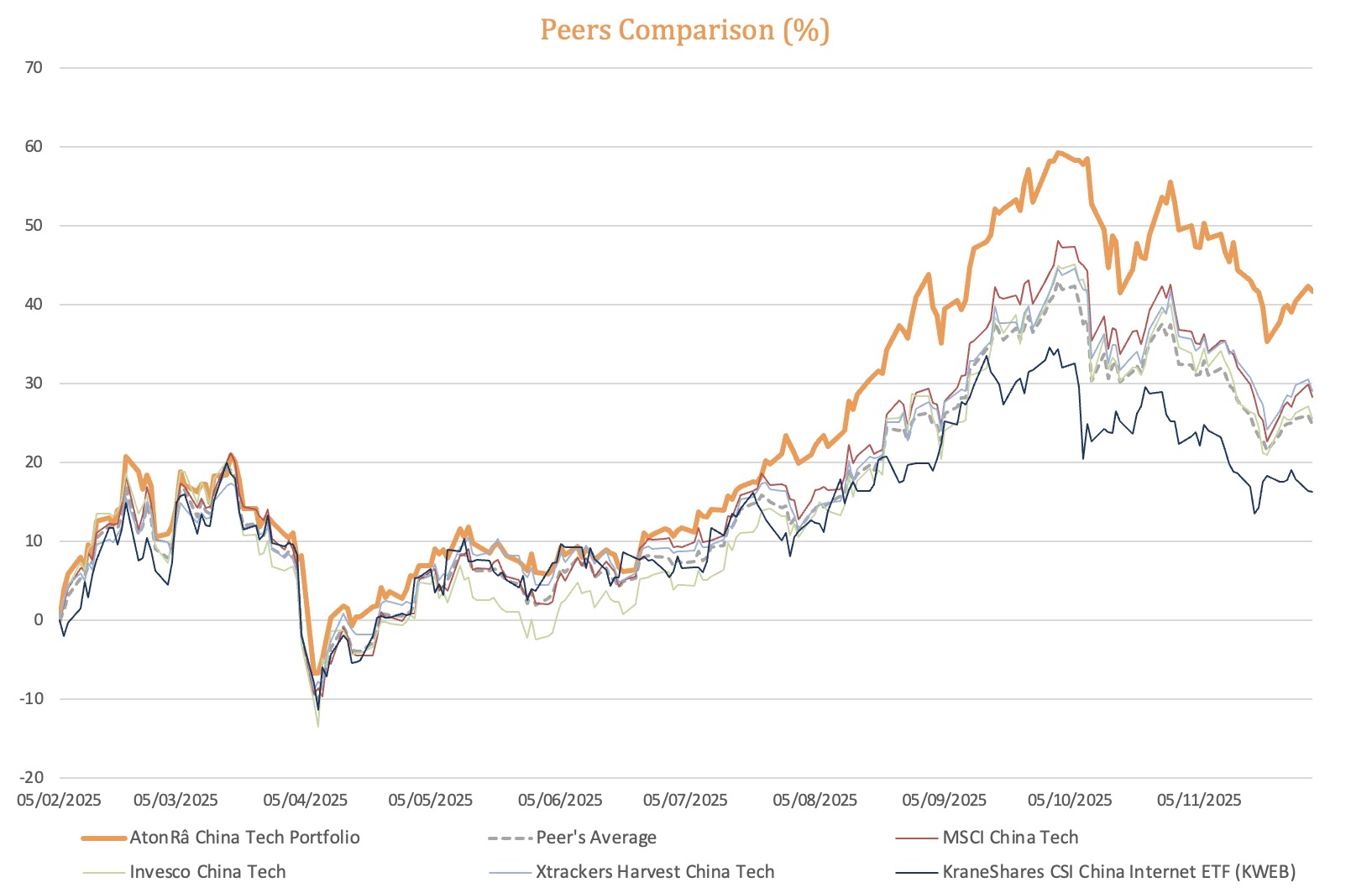 The ~17 percentage point gap versus peers reflects the added value of our underlying universe construction: broader coverage, mid-cap tilt, and pure A/H-share (no ADRs) exposure, capturing where policy capital is flowing.