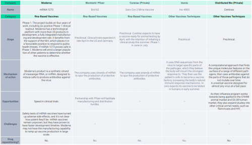 - Moderna is leading the race of the vaccine development and is already in Phase 1, using a mRNA- based approach.