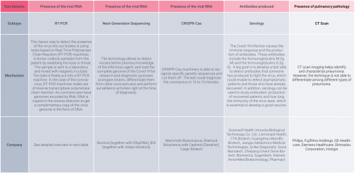The main technological race is in the detection of viral RNA, where RT-PCR tests are the current « golden standard », but Next Generation Sequencing (NGS) and CRISPR-Cas are quickly becoming valid alternatives.