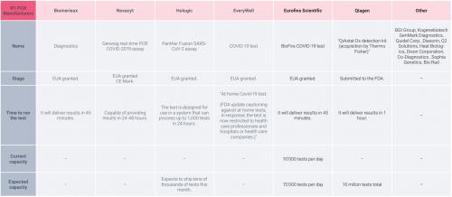 Abbott (ABT US); Abbvie (ABBV US); Abcellera (not listed); AIM Immunotech Inc (AIM US); Alnylam Pharmaceuticals (ALNY US); Altimmune (ALT US); Ascletis Pharma (1672 HK); Bayer (BAY GR); Becton Dickinson (BDX US); BGI Genomics (300676 CN); Biogen (BIIB US); Biomerica Inc (BMRA US); Biomerieux (BIOX FR); Biontech (BNTX US); Cansino Biologics (6185 HK); Chugai (4519 JP); Co-Diagnostics (CODX US); CTK Biotech (not listed); Curevac (not listed); Danaher (DHR US); Diasorin (DIAS IT); Distributed Bio (not listed); Dixon Corporation (not listed); Eli Lilly and Company (LLY US); EUROIMMUN (subsidiary of PerkinElemer Inc, PKI US); EveryWell (not listed); Eurofins Scientific (EUFI FR); Fujifilm (4901 JP); General Electric (GE US); GenMerk Diagnostics (not listed); Gilead Sciences Inc (GILD US); GlaxoSmithKline (GSK LN); Guangzhou Wondfo Biotech (300482 CN); Heat Biologics (HTBX US); Hologic (HOLX US); Illumina (ILMN US); Innovita Biological Technology (not listed); Inovio (INO US); Jiangsu Medomics Medical Technologies (not listed) ;Johnson & Johnson (JNJ US); Kogene Biotech (not listed); LabCorp (LH US); Lemonaid Health (not listed); Mammoth Biosciences (not listed); Medicago (not listed); Mesa Biotech (not listed); Moderna Therapeutics (MRNA US); No Borders (not listed); Novacyt (ALNOV FR); Pfizer (PFI US); PharmACT Holding AG (not listed); Philips (PHG NV); Quest Diagnostics (DGX US); Qiagen NV (QGEN US); Quidel Corp (QDEL US); Q2 Solutions (not listed); Regeneron (REGN US); Rising Pharmaceuticals (not listed); Roche (ROCG SW); Sanofi (SAN FP); Scanwell Health (not listed); Sherlock Biosciences (not listed); Shimadzu Corporation (7701 JP); Siemens (SIE GR); Snibe Diagnostic (not listed); Sona Nanotech (SONA CA); Sophia Holdings Co (6942 JP); Sugentech Inc (253840 KR); Takeda Pharmaceuticals (4502 JP); Thermo Fisher Scientific (TMO US); Tonix (TNXP US); Translate Bio (TBIO US); Vaxart Inc (VXRT US); Veredus Laboratories (not listed); VIR Biotechnology (VIR US); Wuxi Biologics Cayman (2269 HK); Xiamen AmonMed Biotechnology (not listed); Zhejiang Hisun Pharmaceutical (6002676 CN), Zheijiang Orient Gene Biotech (688298 CN)