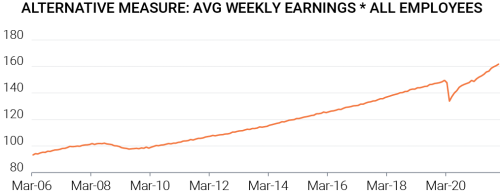 An alternative way to measure actual wage inflation could be based on weekly earnings multiplied by the actual number of workers, thus measuring the aggregate dollar amount given to employees. This is shown in the top-right chart.