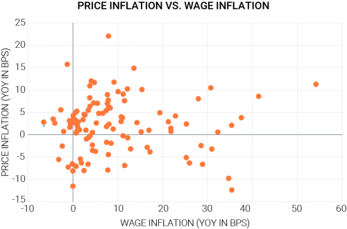 - In industries with price inflation (e.g., used cars), we do not observe wage growth, while in sectors with wage growth (e.g., hospitality), we do not observe price inflation.