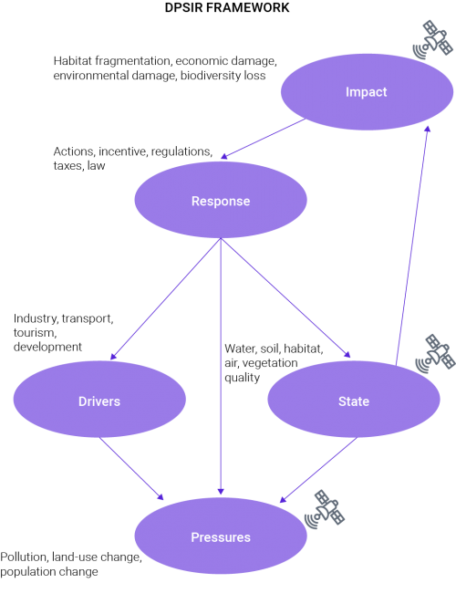 EO is an integral part of the DPSIR framework (seen on the right graph) used for modern decision-making. EO is essential to measure and quantify the most critical components such as pollution, land use, quality of biomes, biodiversity loss, etc.