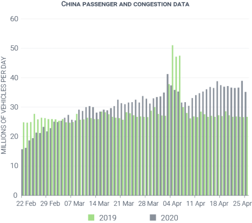- China's highway traffic numbers were back to above 2019 levels by the end of March, while public transport usage remained well below normal.