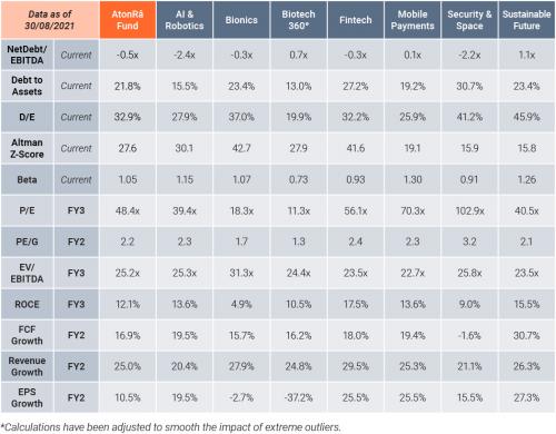 To conclude, we deem it noteworthy to provide a quick summary of our thematic portfolios' financial metrics to understand their profiles better. The quality of companies making up our portfolios is exceptionally high. Looking at the leverage ratios and the indicator of bankruptcy (Altman's Z-Score), we observe that all our portfolios exhibit a solid ability to service debt, show overall low debt levels, and are at a minimum close to no risk of default. Also, companies that enter our portfolios are carefully considered based on numerous efficiency, profitability, and growth metrics. This transpires through a solid ability to generate robust free cash flows and high return on employed capital while delivering strong growth, especially compared with the broader market.