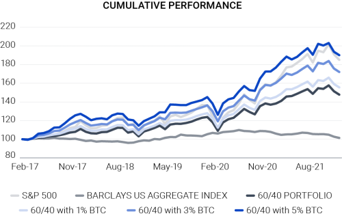 - Any investor with more than 25% exposure to equity can get higher returns for the same level of risks by including 3% of Bitcoin in the asset allocation.