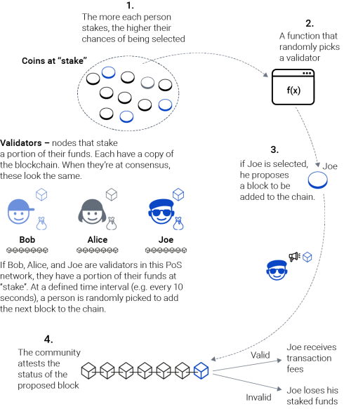 - Proof-of-stake (PoS) validators stake coins to participate and are randomly picked to create a new block, share it with the network, and receive a transaction fee.
