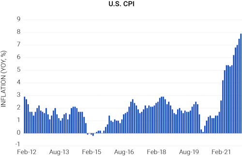 - In March, the Fed revised its GDP growth estimate from 4% to 2.8%, and FOMC members project median inflation for 2022 at 4.3%.