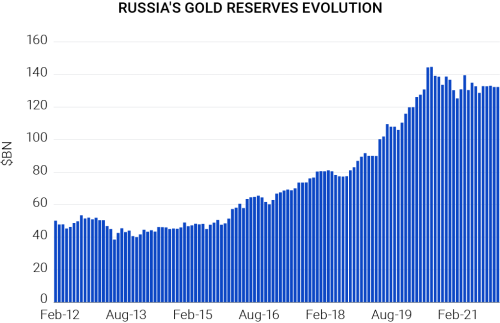 - Russia’s current reserves equal roughly a full year of global gold mining.