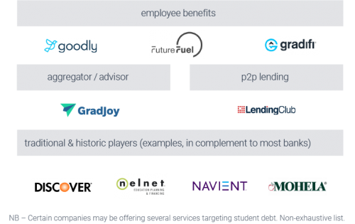 - Aggregator / Advisor: The only company in this category offers a platform to view all outstanding debts on a mobile app; an algorithm then proposes solutions to optimize the student’s situation.