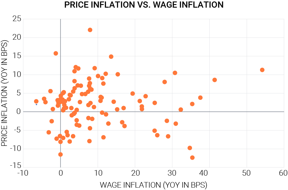 - In industries with price inflation (e.g., used cars), we do not observe wage growth, while in sectors with wage growth (e.g., hospitality), we do not observe price inflation.
