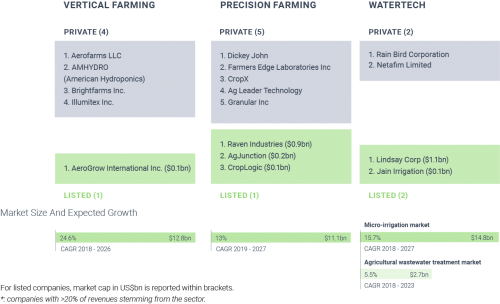 - Water is the key element for both cost savings and environmental impact – vertical- and precision-farming as well as watertech, all cater to a significant reduction in water usage.