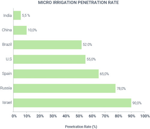 Fresh water scarcity being a major challenge in many dry-regions. While India and China (together representing up to 40% of global irrigated land) have not much adopted micro-irrigation technology, some countries (e.g. Israel) have emerged as technology leaders in innovative irrigation systems.